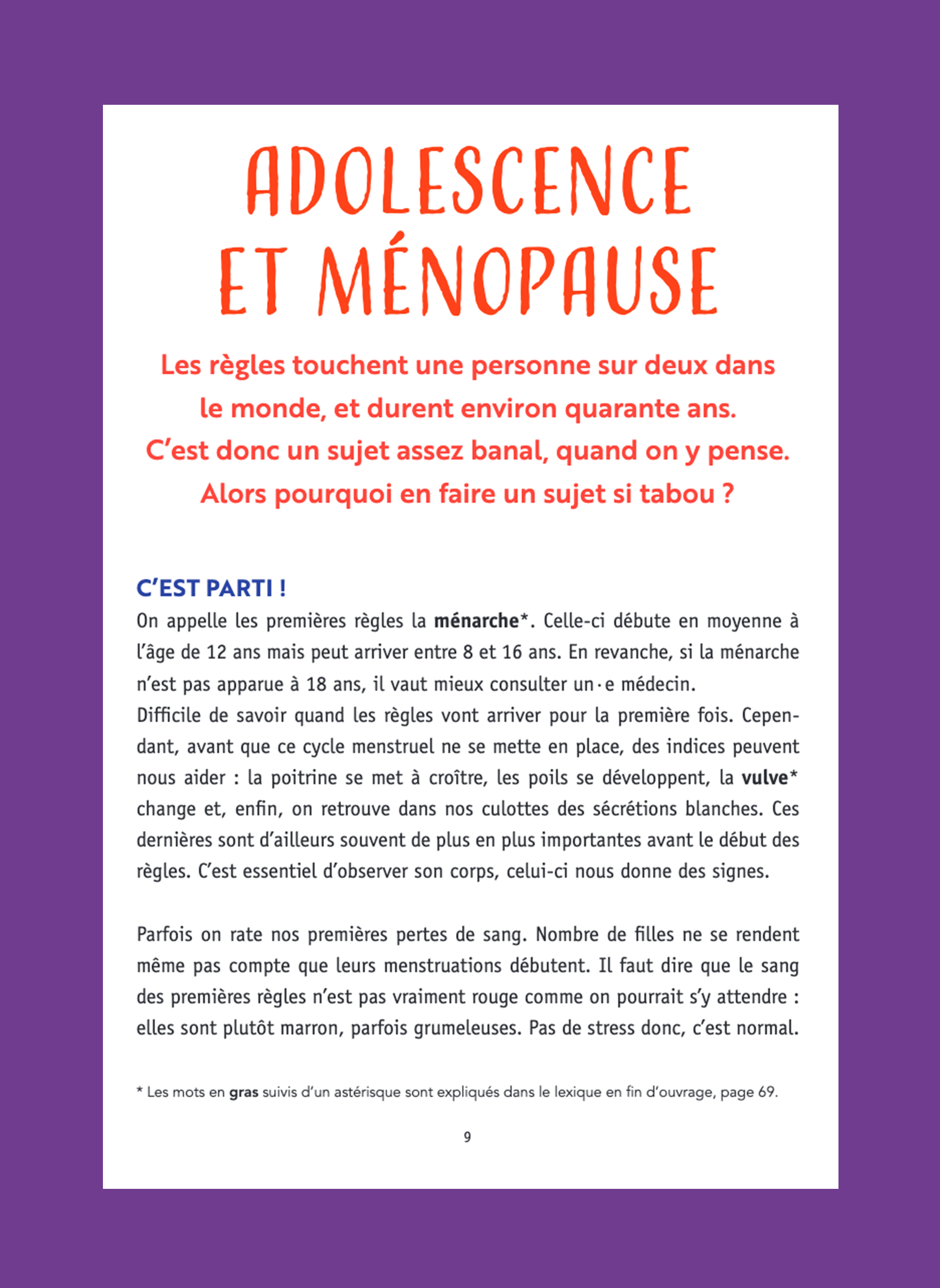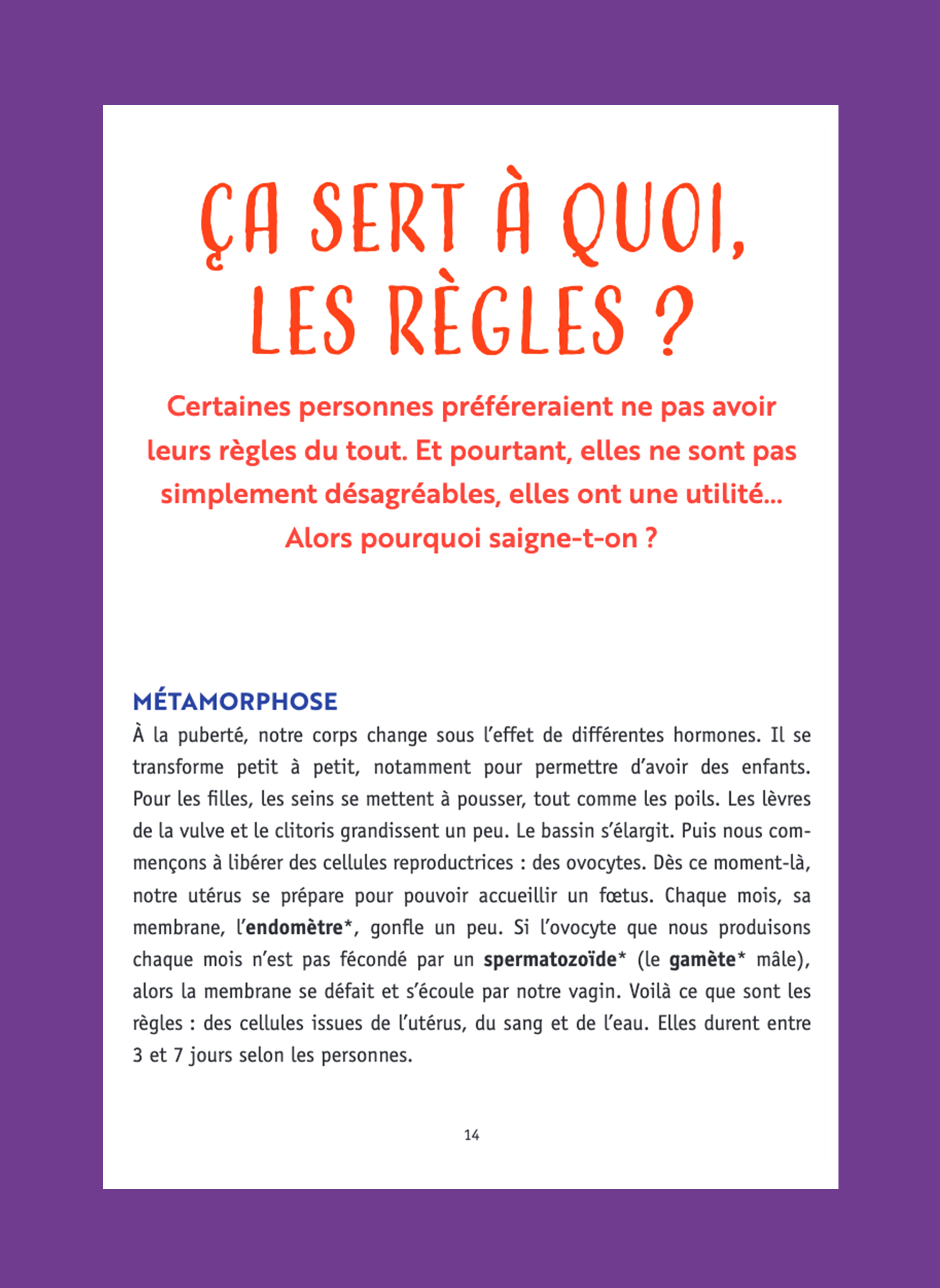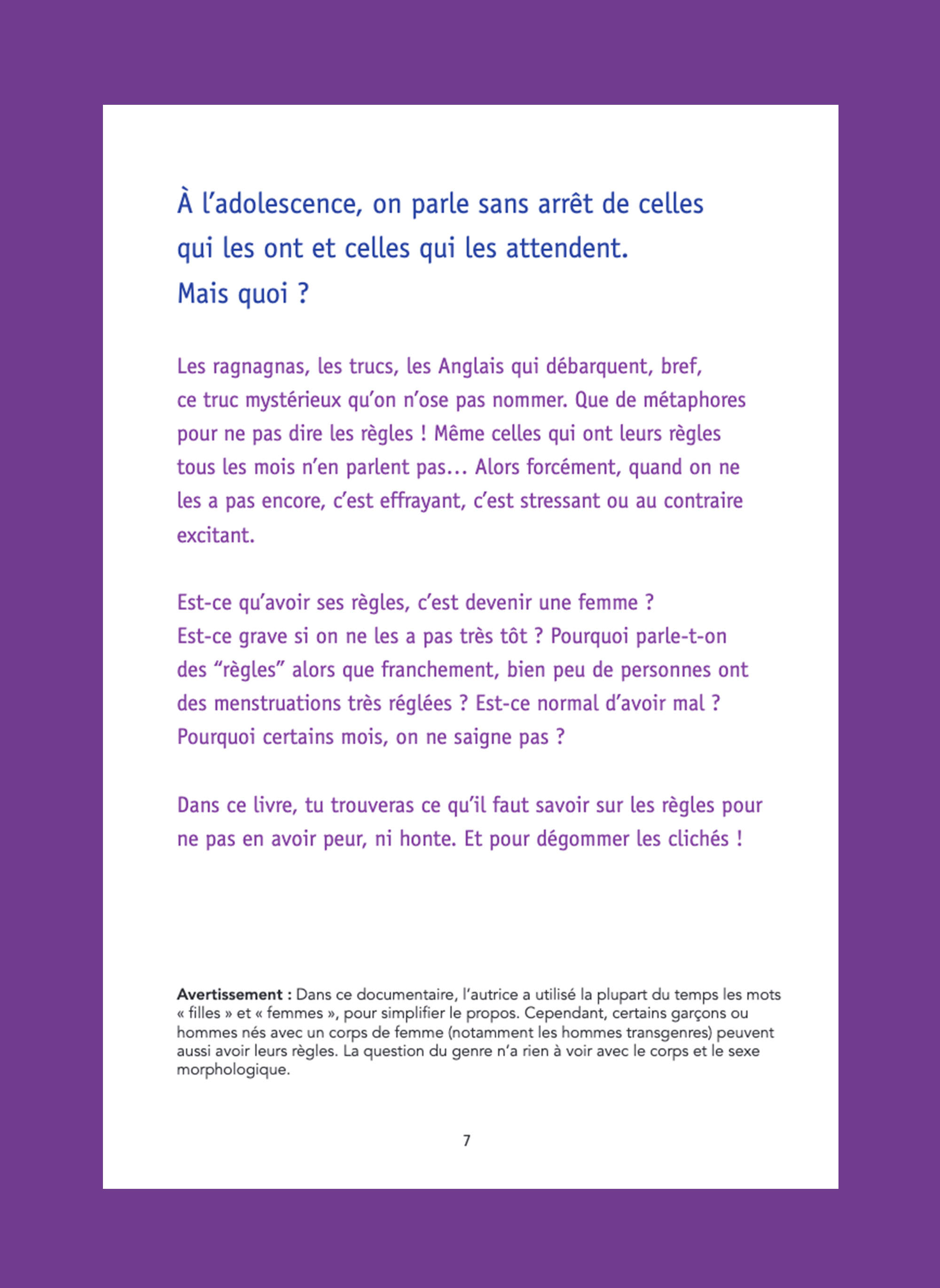 Les règles, qu’est-ce que c’est ? Comment sont-elles perçues à travers le monde et les époques ? Comment faire pour qu’elles ne deviennent pas un obstacle à l’épanouissement des femmes – et à leur vie tout court ? Pour permettre aux jeunes filles de se les réapproprier, et aux garçons de mieux comprendre de quoi il s’agit. Un livre pour démystifier et comprendre ce phénomène qui concerne la moitié de la population, tout en représentant encore trop souvent un tabou.