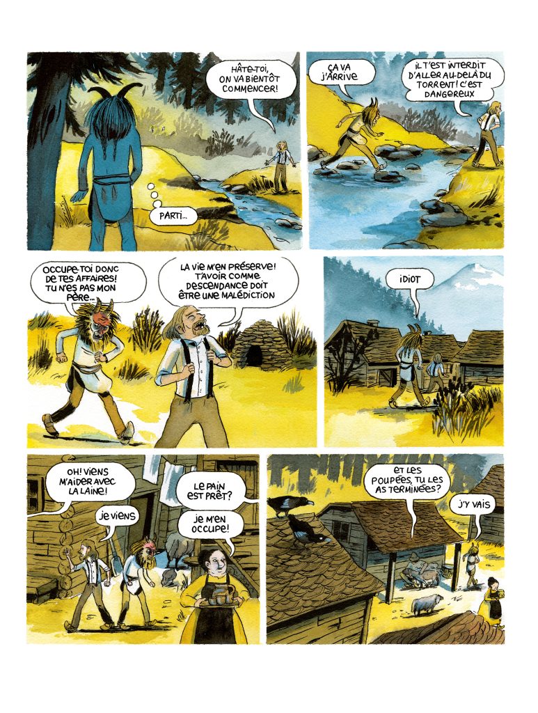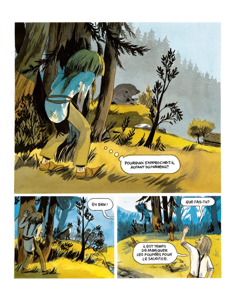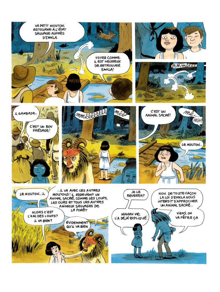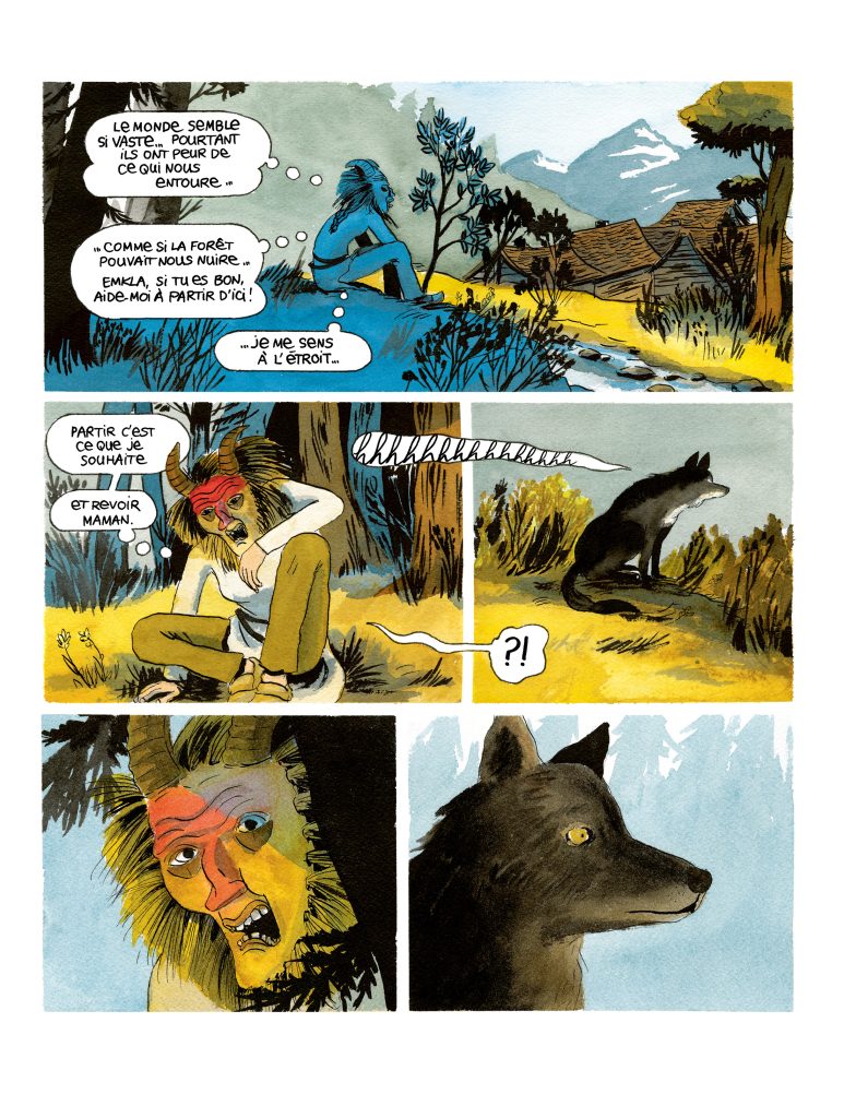 La jeune femme, à l’ombre des arbres et à l’écart du village, semble pensive; elle ressasse, habitée par une envie de partir, de découvrir le monde, au-delà de la forêt et des montages environnantes. C’est la peur qui empêche les villageois d’explorer la forêt et de s’immiscer dans le monde sauvage, la peur d’Emkla, entité vengeresse dont les lois régissent, entre autres choses, les rapports entre humains et non-humains. Alors, quand la loi n’est pas respectée, c’est mille fléaux qui s’abattent sur le petit village. Plutôt que vivre comme une insurgée dans ce village devenu cauchemar, la jeune femme décide de tout quitter et de partir loin, par-delà les grandes roches, à la recherche de la vérité.