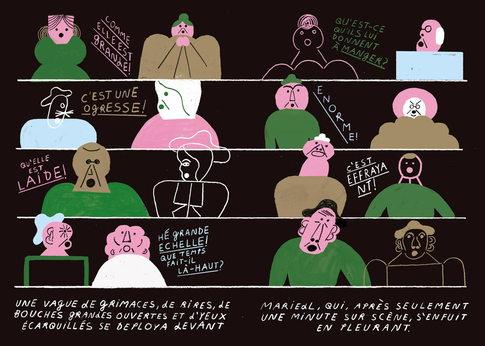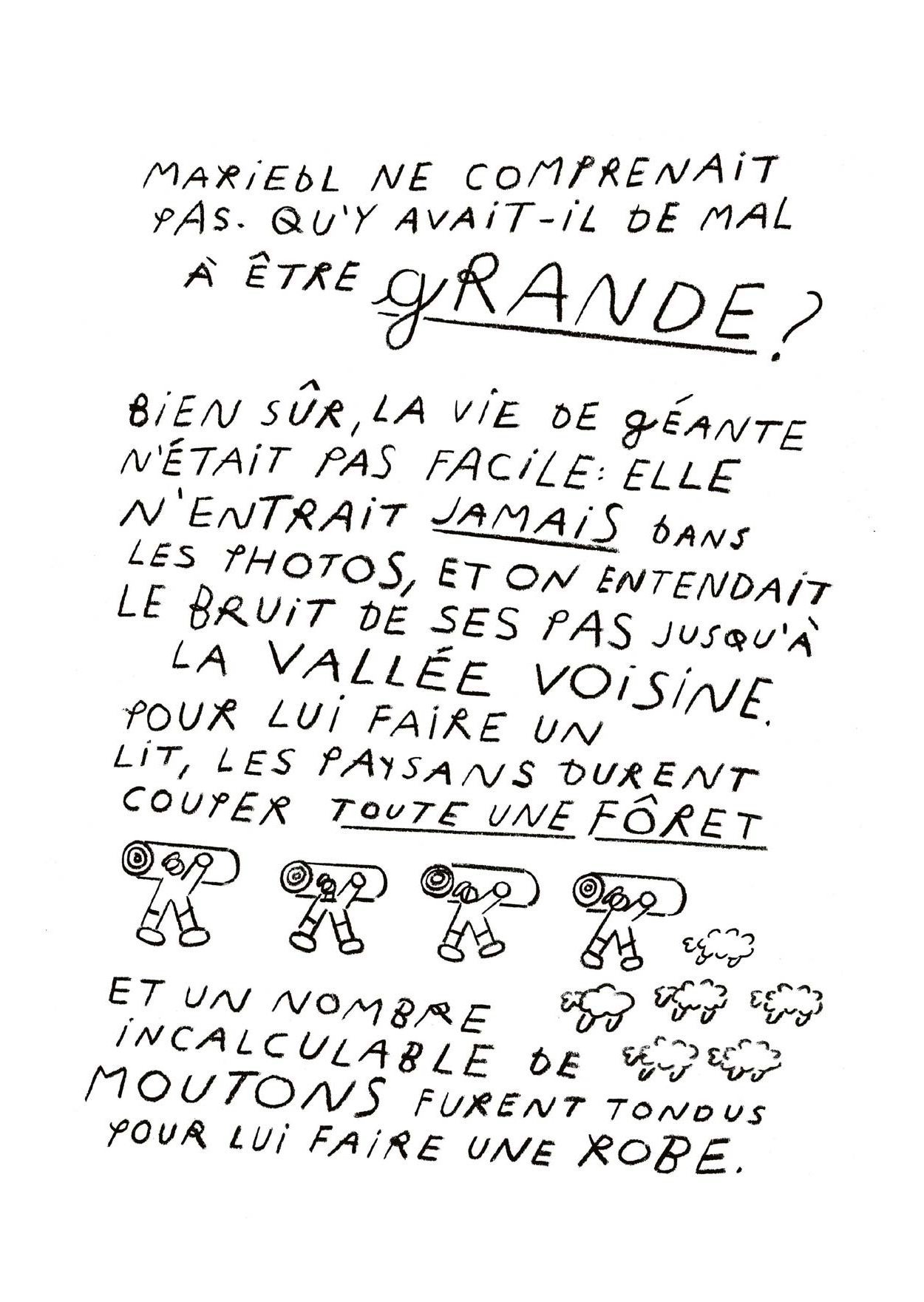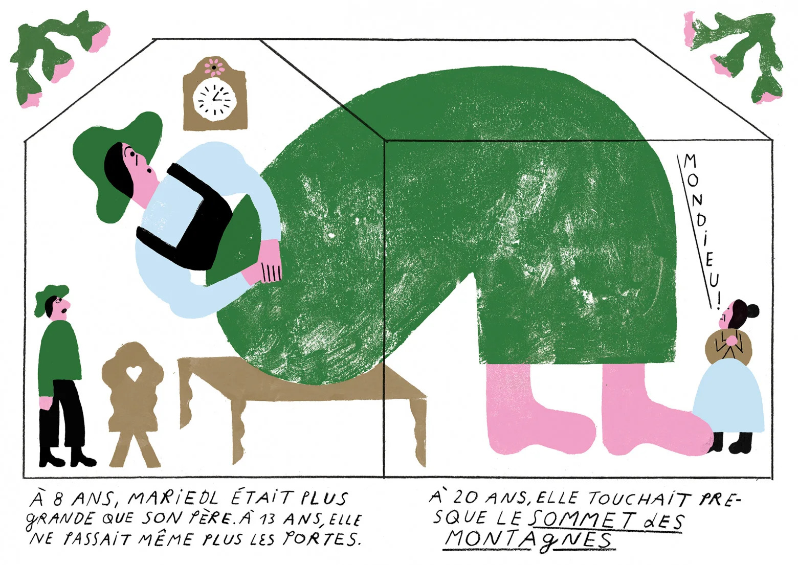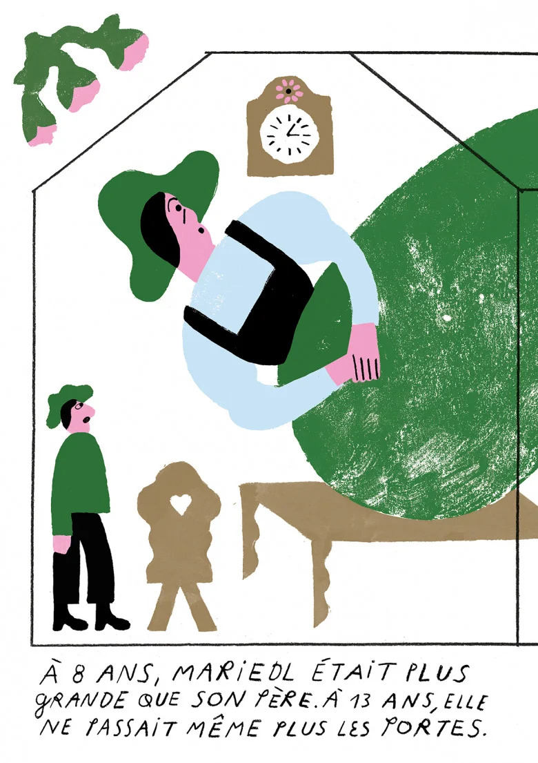 Mariedl était si grande, si gigantesque, qu’elle n’était jamais tranquille: tous la dévisageaient et s’exclamaient à son passage. Ricanements et moqueries étaient son lot quotidien.