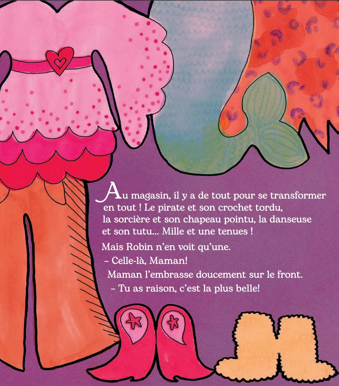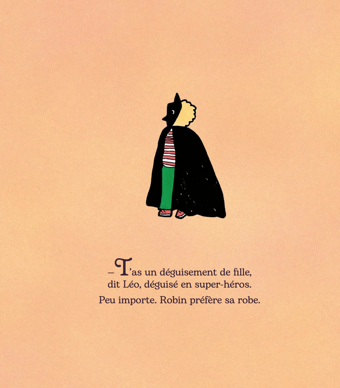 Robin adore sa robe, mais il en vient à douter lorsque, lors de la journée costumée, d’autres enfants se moquent de lui à l’école… Une histoire qui nous parle de libre arbitre et du choix d’être celui ou celle que l’on veut. Une lecture réjouissante et pleine d’humour pour lutter contre les préjugés sexistes avec subtilité.